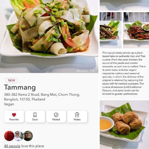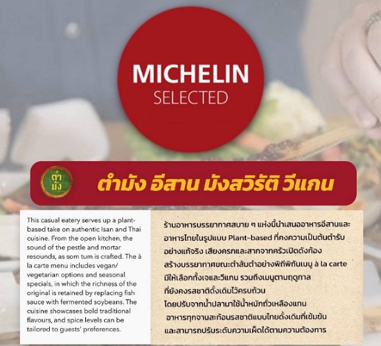 • ตำมัง อีสาน เจ มังสวิรัติ วีแกน (Michelin Selected ปี 2025 วีแกน, เจ) เป็นร้านอาหารแห่งแรกและแห่งเดียวในประเทศไทยที่ได้รับการระบุอย่างชัดเจนด้วยการจัดหมวดหมู่ “วีแกน” ซึ่งถือเป็นจุดเปลี่ยนที่สำคัญในระบบการจัดหมวดหมู่ของคู่มือมิชลิน ไกด์