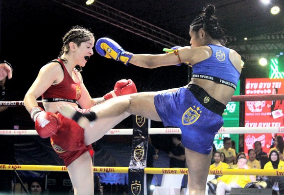 - คู่ที่ 1 ชิงแชมป์มวยไทยนานาชาติ (หญิง) รุ่น 56 กก.เมแกน แม็คเนลลิส กำปั้นสาวชาวอเมริกัน อาศัยรูปร่างได้เปรียบเดินออกอาวุธใส่นักชกสาวไทยเจ้าถิ่น กิ่งแก้ว อินทร์ยิ้มมวยไทย ซึ่งก็ออกอาวุธตอบโต้ตลอดแต่ลูกหนักหน่วงเป็นของกำปั้นสาวอเมริกันครบ 3 ยกกรรมการชูมือให้ เมแกน แม็คเนลิส ชนะคะแนน 29 : 28 คว้าเข็มขัดมวยไทยนานาชาติรุ่น 56 กก.หญิงไปครอง