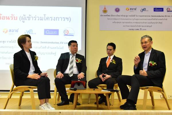 รศ.ดร.นพพร ลีปรีชานนท์ รองผู้อำนวยการสกสว. เผยว่า สกสว. มอบหมายให้ หน่วยบริหารและจัดการทุนด้านการพัฒนากำลังคนและสถาบันอุดมศึกษา การวิจัยและนวัตกรรม (บพค.) บริหารจัดการทุนวิจัยภายใต้แผนงาน F13 เพื่อผลิตและพัฒนาบุคลากรด้านวิทยาศาสตร์ วิจัยและนวัตกรรมที่มีทักษะสูง โดยมีเป้าหมายสอดคล้องกับยุทธศาสตร์ด้านวิทยาศาสตร์ วิจัยและนวัตกรรมของประเทศ ในประเด็น “ประเทศไทยเกิดงานใหม่ ทักษะสูง รายได้ดี ใน 3 อุตสาหกรรม ได้แก่ Semiconductor, EV และ AI” ทั้งนี้ บพค.ได้อนุมัติทุนประจำปี 2568 ให้แก่มหาวิทยาลัยเทคโนโลยีราชมงคลธัญบุรีเพื่อดำเนินโครงการดังกล่าว โดยชี้ช่องทางให้กับผู้ประกอบการว่า การพัฒนากำลังคนเป็นต้นน้ำที่มีคุณค่าที่สุด ซึ่งจะนำไปสู่การสรรสร้างต้นแบบผลิตภัณฑ์ฐานเทคโนโลยีที่มีโอกาสพัฒนาให้เป็นวิสาหกิจเริ่มต้น (Startup) และขยายฐานให้เติบโตเป็นธุรกิจฐานนวัตกรรม (IDE) ในอนาคต โดยมีหน่วยบพค. บพข. และ สนช. เป็นแหล่งสนับสนุนงบประมาณที่ผู้ประกอบการและนักวิจัยสามารถเข้าถึงได้ร่วมกัน