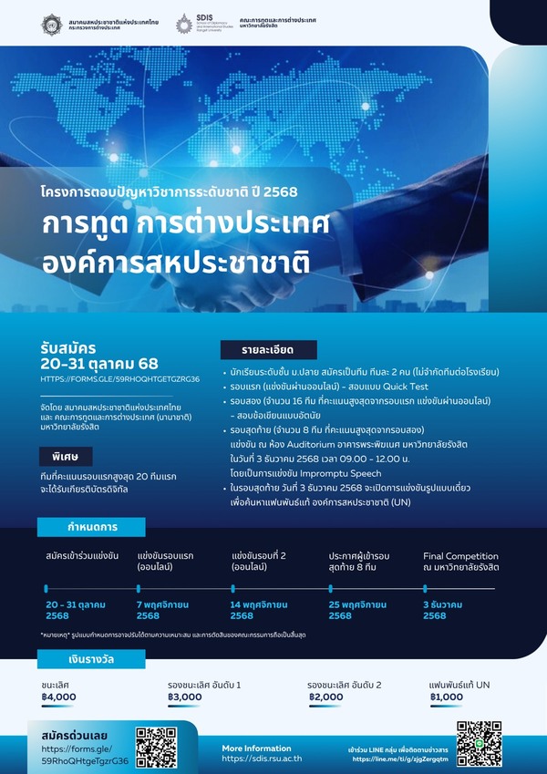 คณะการทูตและการต่างประเทศ มหาวิทยาลัยรังสิต ร่วมมกับสมาคมสหประชาชาติแห่งประเทศไทย กระทรวงการต่างประเทศ จัด “การแข่งขันการตอบปัญหาวิชาการด้านการทูต การต่างประเทศ และองค์การสหประชาชาติ ประจำปี 2558” เพื่อส่งเสริมความรู้ ความเข้าใจ และแรงบันดาลใจ ในการก้าวสู่เส้นทางนักการทูตรุ่นใหม่ของประเทศไทย ในวันที่ 3 ธันวาคม 2568 เวลา 09.00 – 12.00 น. ณ ห้อง Auditorium อาคารพระพิฆเนศ (อาคาร 6) มหาวิทยาลัยรังสิต ทั้งนี้ สำหรับผู้ที่สนใจสามารถสมัครเข้าร่วมกิจกรรมได้ตั้งแต่วันนี้ – วันที่ 31 ตุลาคม 2568 ได้ที่ https://forms.gle/59RhoQHtgeTgzrG36 หรือสอบถามรายละเอียดเพิ่มเติมได้ที่ คณะการทูตและการต่างประเทศ มหาวิทยาลัยรังสิต Line: https://line.me/ti/g/zjgZergqtm หรือ Facebook: The School of Diplomacy and International Studies, Rangsit University (คณะการทูตและการต่างประเทศ)