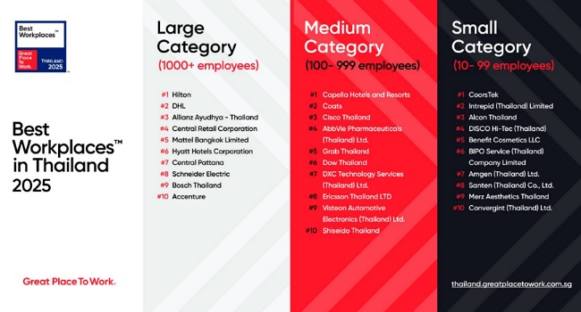 Great Place To Work® องค์กรชั้นนำระดับโลกด้านวัฒนธรรมองค์กร เผยรายชื่อ Best Workplaces™ in Thailand 2025 อย่างเป็นทางการภายในงานแถลงข่าวและพิธีมอบรางวัลสุดยิ่งใหญ่ ณ โรงแรม Millennium Hilton Bangkok เพื่อเฉลิมฉลองให้องค์กรที่เป็นแบบอย่างแห่งความไว้วางใจ ความเท่าเทียม และภาวะผู้นำที่ให้ความสำคัญกับ “คน” ในการขับเคลื่อนการเปลี่ยนแปลงในทุกอุตสาหกรรม