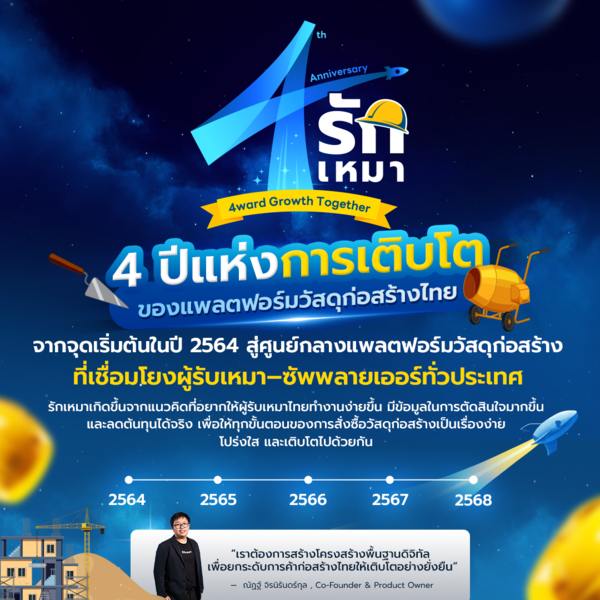 “4 ปีที่ผ่านมา เราเห็นการเปลี่ยนแปลงของวงการก่อสร้างไทยอย่างชัดเจน ทั้งด้านเทคโนโลยีและพฤติกรรมผู้บริโภค รักเหมาตั้งใจเป็นเพื่อนร่วมทาง ที่ช่วยให้ทุกคนในวงการสามารถเติบโตไปข้างหน้าด้วยกัน – อย่างฉลาดขึ้น ง่ายขึ้น ประหยัดขึ้น และไวขึ้น”