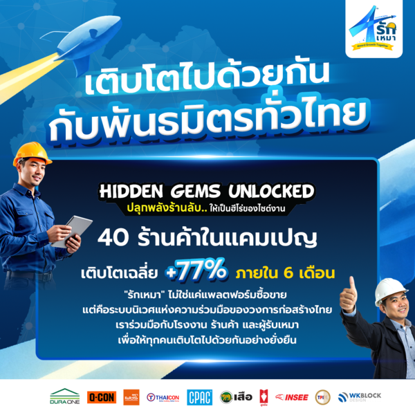 ตลอดเส้นทางที่ผ่านมารักเหมาได้ร่วมมือกับพันธมิตรหลากหลายระดับ ทั้งผู้ผลิตวัสดุก่อสร้าง โรงงาน และร้านค้าในท้องถิ่น เพื่อขับเคลื่อนวงการให้เข้มแข็งขึ้นอย่างยั่งยืน และที่สำคัญคือเราไม่เพียงแต่สร้างแพลตฟอร์มซื้อขาย แต่รักเหมายังสร้าง ระบบนิเวศ (Ecosystem) ในวงการวัสดุก่อสร้าง ที่ช่วยยกระดับทั้งผู้ซื้อและผู้ขายให้เติบโตไปพร้อมกัน อาทิเช่น จากแคมเปญ Hidden Gems Unlock – ปลุกพลังร้านลับให้กลายเป็นฮีโร่ของไซต์งาน ยอดขายของร้านที่เข้าร่วมแคมเปญ 40 ร้านค้า มีเฉลี่ยเติบโตกว่าปีที่แล้วในช่วงเวลา 6 เดือนเดียวกันสูงถึง 77% และ มี 27 ร้าน จาก 40 ร้านที่เติบโตมากกว่า 1 เท่าตัว (Gr.100%ขึ้นไป) , ระบบช่วยอำนวยความสะดวกเรื่องการติดตามใบกำกับภาษี ซึ่งร้านค้าที่เข้าร่วมการขายบายนาว จะต้องแนบใบกำกับภาษีในระบบ ซึ่งช่วยให้ผู้รับเหมาประหยัดเวลาติดตามเอกสาร ซึ่งมีจำนวนค่อนข้างมากในแต่ละเดือน