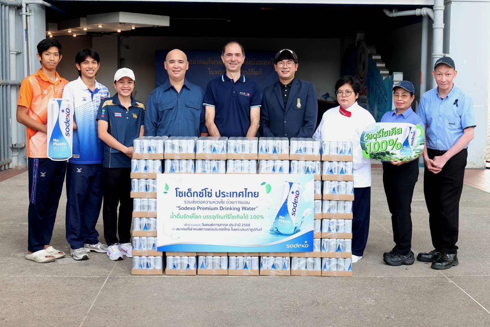 โซเด็กซ์โซ่ ประเทศไทย ผู้นำระดับโลกด้านบริการอาหารที่ยั่งยืนและการมอบประสบการณ์ที่มีคุณค่าในทุกช่วงเวลาของชีวิตจากประเทศฝรั่งเศส นำโดย คุณอาร์โนด์ เบียเลคกิ (กลาง) กรรมการผู้จัดการ ประจำภูมิภาคเอเชียตะวันออกเฉียงใต้ พร้อมทีมผู้บริหารและพนักงานโซเด็กซ์โซ่ผู้ที่มีความบกพร่องทางร่างกาย ร่วมเป็นตัวแทนส่งมอบน้ำดื่มพรีเมียมในบรรจุภัณฑ์กระป๋องอลูมิเนียมรีไซเคิล 100% จำนวน 1,200 กระป๋อง แก่สมาคมกีฬาคนพิการแห่งประเทศไทย ในพระบรมราชูปถัมภ์ โดยมี คุณสราวุธ แสงสุข (ที่ 4 จากขวา) รองเลขาธิการ พร้อมด้วยตัวแทนนักกีฬาคนพิการร่วมรับมอบ