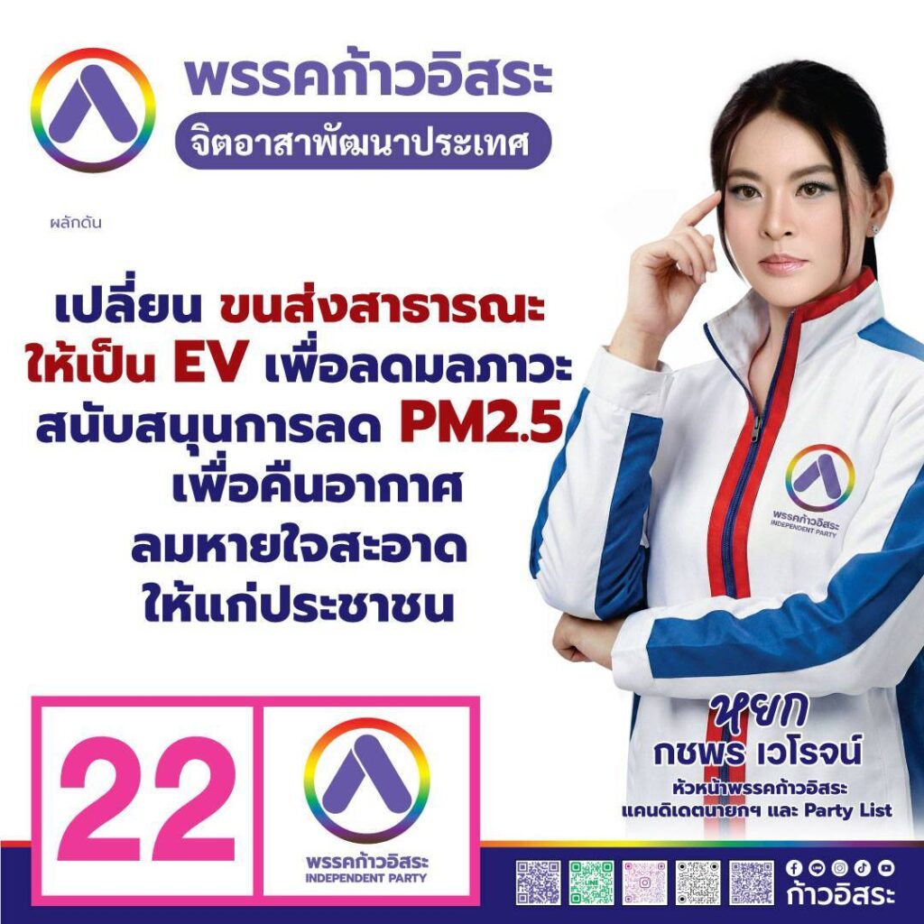 นางสาวกชพร เวโรจน์ หัวหน้าพรรคก้าวอิสระ แคนดิเดตนายกรัฐมนตรี และปาร์ตี้ลิสต์ พรรคก้าวอิสระ เบอร์22 ขอเรียนเชิญสื่อมวลชนร่วมทำข่าวและเก็บภาพกิจกรรมเชิงสัญลักษณ์ครั้งสำคัญภายใต้แคมเปญ “เมืองไทย สีเขียวด้วยระบบขนส่ง EV” โดยจะมีการรวมตัวครั้งยิ่งใหญ่ของรถตุ๊กตุ๊กกว่า 100 คัน ณ พิพิธภัณฑ์สวนป่าเบญจกิติ เพื่อผลักดันนโยบายการเปลี่ยนผ่านเครื่องยนต์รถโดยสารสาธารณะให้เป็นระบบไฟฟ้าอย่างเต็มรูปแบบ ซึ่งถือเป็นหัวใจสำคัญในการแก้ปัญหามลภาวะทางอากาศอย่างยั่งยืน โดยมุ่งเน้นการกำจัดต้นตอของฝุ่น PM 2.5 และลดมลพิษทางเสียงในเขตเมือง เพื่อคืนอากาศบริสุทธิ์และสร้างคุณภาพชีวิตที่ดีขึ้นให้แก่ประชาชน ในขณะที่ยังคงรักษามนต์เสน่ห์และเอกลักษณ์ของตุ๊กตุ๊กไทยให้คงอยู่คู่กับการเป็นพาหนะพลังงานสะอาด ก่อนหน้านี้ได้มีการจัดกิจกรรมรณรงค์ขนส่งสาธารณะให้ขับเคลื่อนด้วยพลังงานไฟฟ้าที่เชียงใหม่มาแล้ว