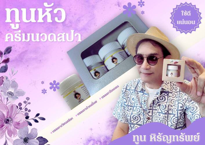 - ทูนหัว ครีมนวดสปา: มี 1 สูตรมาตรฐาน เนื้อโลชั่นสูตรพิเศษ ซึมง่ายไม่เหนียวเหนอะหนะ ให้ความรู้สึกเย็นสบายไม่แสบร้อนผิว ช่วยบรรเทาอาการปวดเมื่อยจากการเดินทางและกิจกรรมต่างๆ ได้อย่างเห็นผล