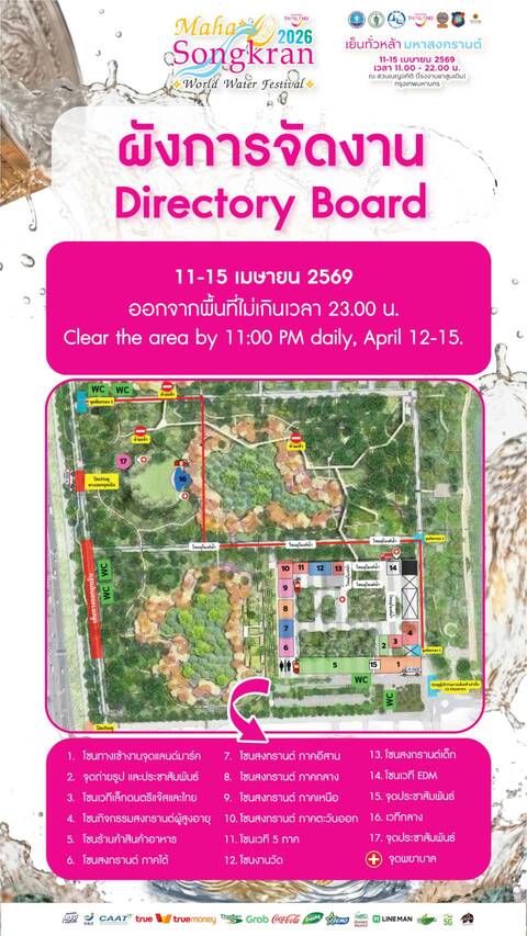 ตลอด 5 วันของการจัดงาน อัดแน่นด้วยกิจกรรมครบทุกเจเนอเรชั่น ทั้งการแสดงศิลปวัฒนธรรมและโชว์ร่วมสมัยบนเวทีกลาง รวมถึงไฮไลต์การแสดงโดรนแปรอักษรกว่า 1,200 ลำ ที่จะถ่ายทอดคุณค่าของ “ประเพณีสงกรานต์ไทย” จำนวน 10 ภาพ เติมสีสันเหนือท้องฟ้ายามค่ำคืน เวลา 20.00 น. ของทุกวันจัดงาน ขณะเดียวกัน โซน “สงกรานต์ 5 ภูมิภาค” เปิดให้สัมผัสเสน่ห์ไทยครบทุกมิติ ตั้งแต่เวลา 11.00–22.00 น. ผ่านการแสดงศิลปวัฒนธรรมเฉพาะถิ่น กิจกรรม DIY และจำหน่ายสินค้าท้องถิ่นอัตลักษณ์เด่นจากทั่วประเทศ เพิ่มความอบอุ่นด้วยบรรยากาศงานวัดสุดคลาสสิก ทั้งก่อพระเจดีย์ทราย บ้านผีสิง ชิงช้าสวรรค์ และสรงน้ำพระ พร้อมโซนสำหรับผู้สูงอายุ เด็ก และโซนจำหน่ายอาหารและผลิตภัณฑ์ไทยกว่า 100 ร้านค้า ก่อนปิดท้ายความมันส์ที่ลานเล่นน้ำและเวที EDM ตั้งแต่เวลา 16.00–22.00 น. ที่ขนทัพดีเจชื่อดังมาปลุกพลังความมันส์ทุกค่ำคืน และคอนเสิร์ตจากศิลปินไทย ตั้งแต่เวลา 17.00–22.00 น. ทุกวัน ไม่ว่าจะเป็น FOOL STEP, ZANI, Zeal, กระแต, ASIA7, The Mousses, LHAM SOMPHOL, INK WARUNTORN, MONICA, Playground, Palmy, MAIYARAP, Clockwork Motionless, 4EVE, Bodyslam, Taitosmith, MEYOU, Getsunova, Tilly Birds และ Joey Boy ที่จะผลัดเปลี่ยนมาสร้างความคึกคักตลอดงาน