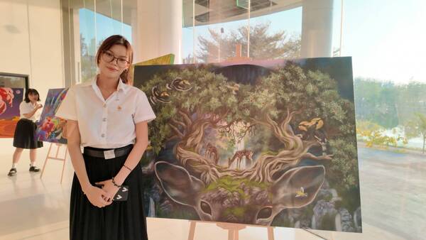 ในส่วนของผลงานด้านจิตรกรรม นางสาวประวีณา เลขนอก เล่าว่า ‘ใต้ร่มเงา’ ใช้เทคนิคสีอะคริลิกบนผ้าใบ ถ่ายทอดภาพในอุดมคติของธรรมชาติและสัตว์ป่าที่อยู่ร่วมกันอย่างสันติและเกื้อกูล ภายใต้บรรยากาศที่เต็มไปด้วยความอุดมสมบูรณ์และความสงบสุข เพื่อกระตุ้นให้ผู้ชมตระหนักถึงความสำคัญของสิ่งแวดล้อมและการอยู่ร่วมกันอย่างสมดุล ซึ่งเป็นหัวใจสำคัญของความยั่งยืนในธรรมชาติ