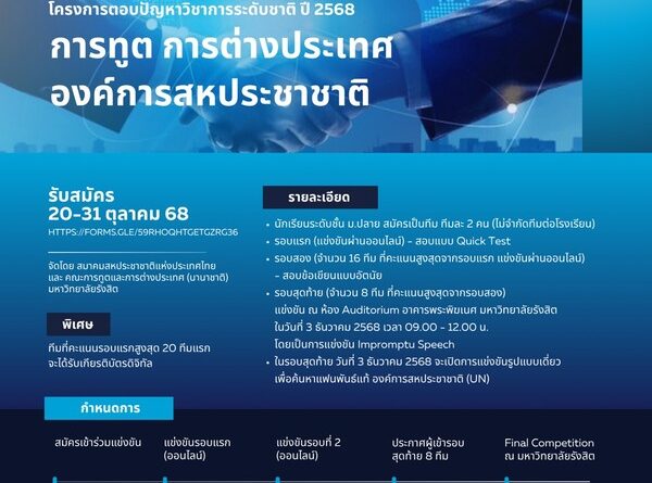ฝ่ายกิจการนักศึกษา วิทยาลัยศิลปศาสตร์ มหาวิทยาลัยรังสิต จัดกิจกรรมสัมมนาเชิงปฏิบัติการ “บุคลิกภาพนักศึกษาใหม่ ประจำปี 2568” โดยมีวัตถุประสงค์เพื่อเสริมสร้างความเป็นผู้นำ การทำงานเป็นทีม และการอยู่ร่วมกันอย่างสร้างสรรค์ พร้อมปลูกฝังจิตสำนึกความเป็นพลเมืองในสังคมประชาธิปไตย กิจกรรมตลอด 3 วันเต็ม ได้รับความร่วมมืออย่างอบอุ่นจากคณาจารย์ และการมีส่วนร่วมอย่างสร้างสรรค์จากนักศึกษาทุกชั้นปี ณ วิลล่า พาราดี