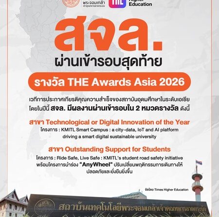 สจล. โดดเด่นด้านนวัตกรรมดิจิทัล และคุณภาพชีวิตนักศึกษาบนเวที THE Awards และ THE Rankings ตอกย้ำคุณภาพสถาบันการศึกษาไทยระดับเอเชีย